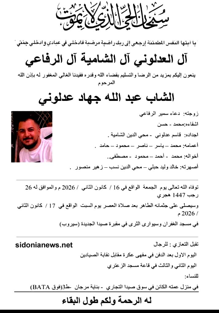 وفاة الشاب عبدالله جهاد عدلوني 17-1-2026 أل عدلوني والشامية والرفاعي وحبلي ونسب ومنصور (وفيات صيدا – لبنان – جريدة صيدونيانيوز.نت )