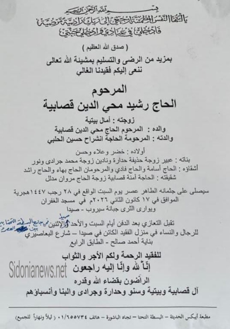 وفاة الحاج رشيد محي الدين قصابية 17-1-2026 آل قصابية وبيتية والحلبي وحدارة وجرادي ومدلل (وفيات صيدا – لبنان – جريدة صيدونيانيوز.نت)