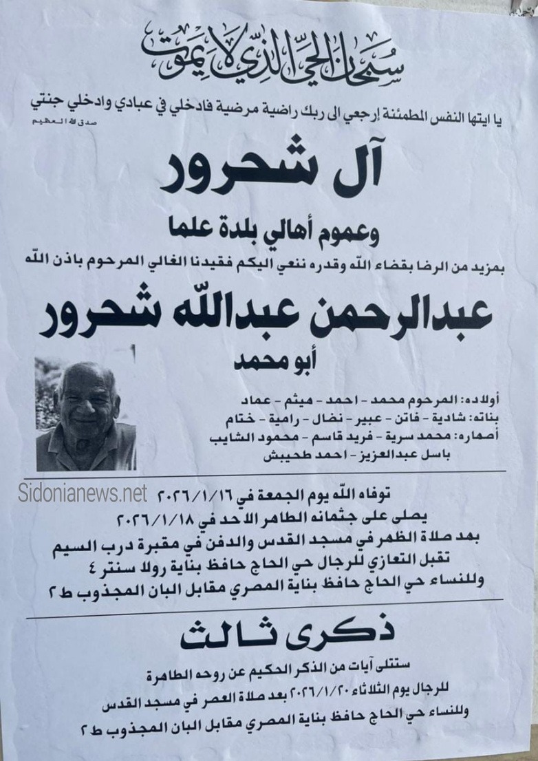 وفاة عبدالرحمن عبدالله شحرور -20-1-2026 آل شحرور وسرية والشايب وعبدالعزيز وطحيبش-(وفيات صيدا لبنان - جريدة صيدونيانيوز.نت)