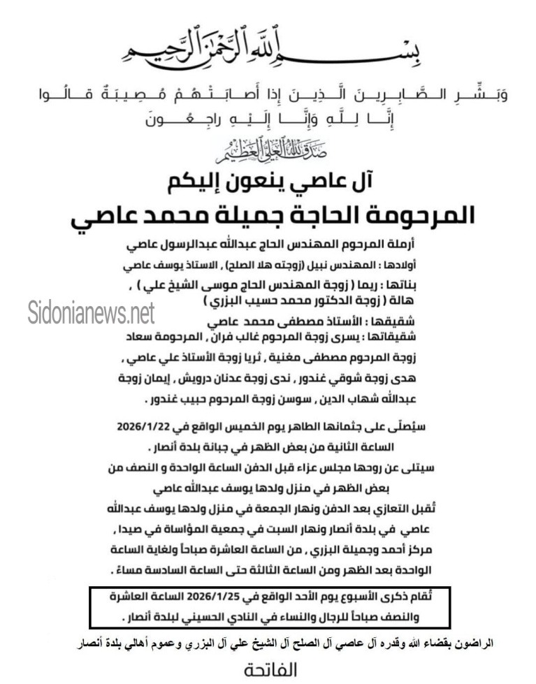 وفاة المرحومة الحاجة جميلة محمد عاصي - 21-1-2026 آل عاصي - والدة زوجة الدكتور محمد حسيب البزري (وفيات صيدا لبنان - جريدة صيدونيانيوز.نت)