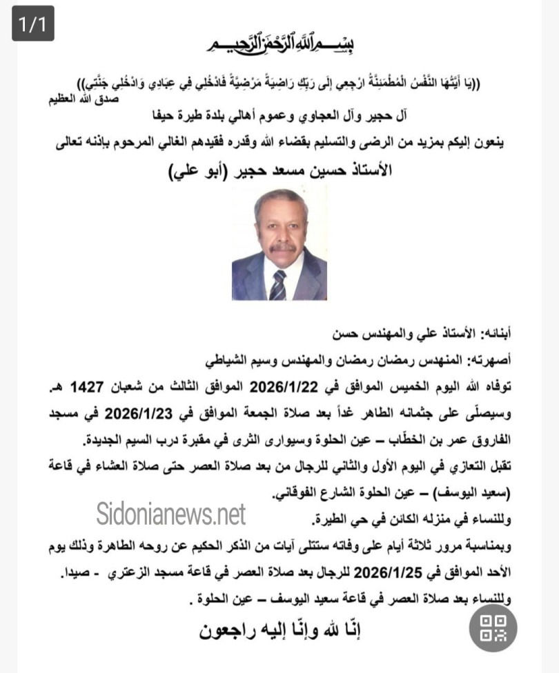 جريدة صيدونيانيوز.نت / وفاة الأستاذ حسين مسعد حجير -23-1-2026 آل حجير ورمضان والشياطي (وفيات صيدا عين الحلوة لبنان وفلسطين- جريدة صيدونيانيوز.نت)