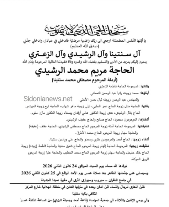 جريدة صيدونيانيوز.نت / وفاة الحاجة مريم محمد الرشيدي(أرملة المرحوم مصطفى سنتينا ) - 24-1-2026- الدفن 25-1-2026 آل سنتينا والرشيدي والزعتري (وفيات صيدا لبنان - جريدة صيدونيانيوز.نت)