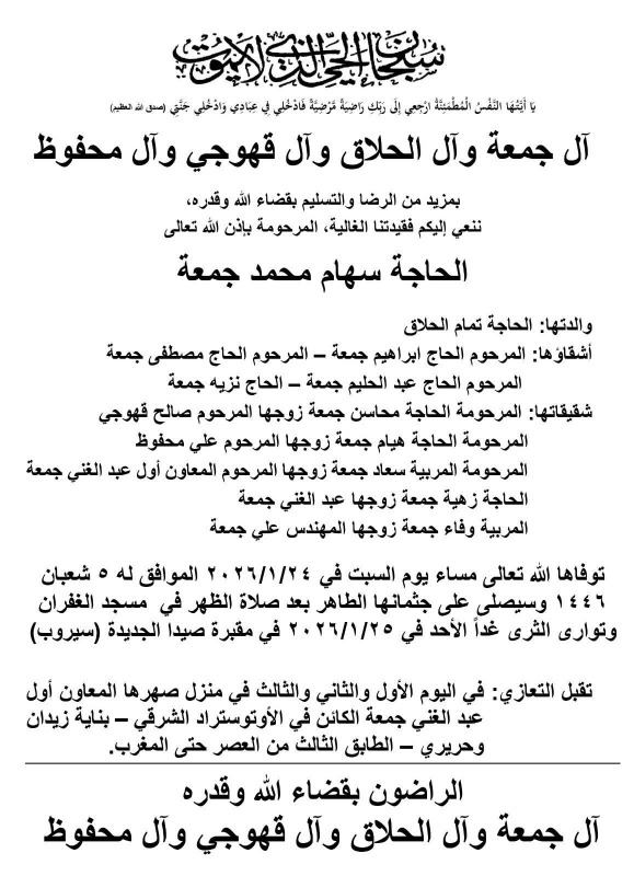 جريدة صيدونيانيوز.نت / وفاة الحاجة سهام محمد جمعة - 25-1-2026 آل جمعة والحلاق وقهوجي ومحفوظ (وفيات صيدا لبنان - جريدة صيدونيانيوز.نت) 2026-01-24 Sidonianews.net ----------- وفاة الحاجة سهام محمد جمعة - 25-1-2026 آل جمعة والحلاق وقهوجي ومحفوظ (وفيات صيدا لبنان - جريدة صيدونيانيوز.نت) 2026-01-24