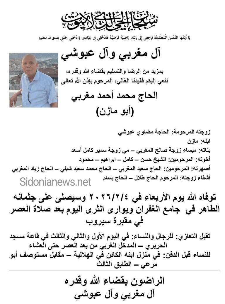 وفاة الحاج محمد أحمد مغربي -4-2-2026-آل مغربي وعبوشي -(وفيات صيدا لبنان -جريدة صيدونيانيوز.نت)