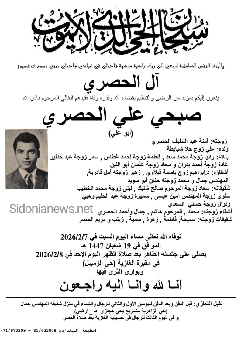 وفاة صبحي علي الحصري - الدفن الاحد8-2-2026  - آل الحصري (وفیات صیدا لبنان -جريدة صيدونيانيوز.نت)