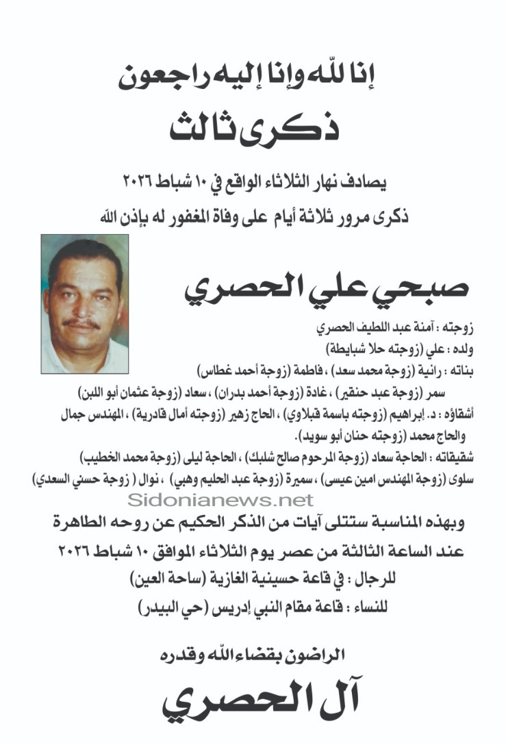 جريدة صيدونيانيوز.نت / ذكرى ثالث صبحي علي الحصري - 10-2-2026 - آل الحصري (وفیات صیدا لبنان -جريدة صيدونيانيوز.نت)