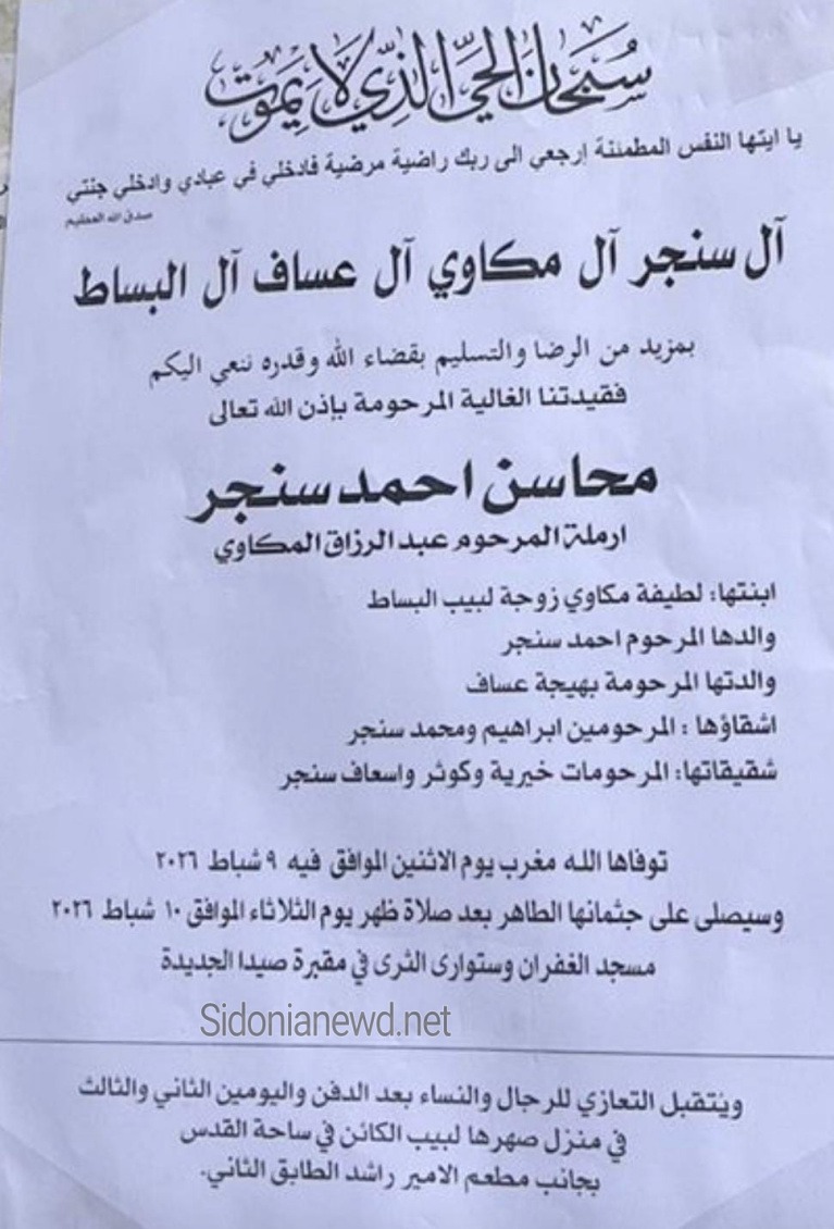 جريدة صيدونيانيوز.نت / وفاة محاسن أحمد سنجر 10-2-2026 آل سنجر ومكاوي وعساف والبساط (وفيات صيدا – لبنان – جريدة صيدونيانيوز.نت) 2026-02-10 Sidonianews.net ------------------- وفاة محاسن أحمد سنجر 10-2-2026 آل سنجر ومكاوي وعساف والبساط (وفيات صيدا – لبنان – جريدة صيدونيانيوز.نت) 2026-02-10