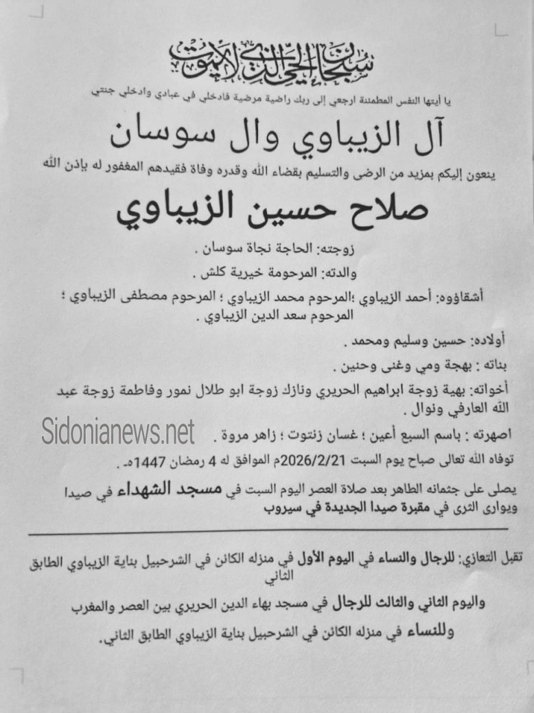 جريدة صيدونيانيوز.نت / وفاة صلاح حسين الزيباوي -21-2-2026 -آل الزيباوي و سوسان-(وفيات صيدا لبنان -جريدة صيدونيانيوز.نت) 2026-02-21 Sidonianews.net ----- وفاة صلاح حسين الزيباوي -21-2-2026 -آل الزيباوي و سوسان-(وفيات صيدا لبنان -جريدة صيدونيانيوز.نت) 2026-02-21
