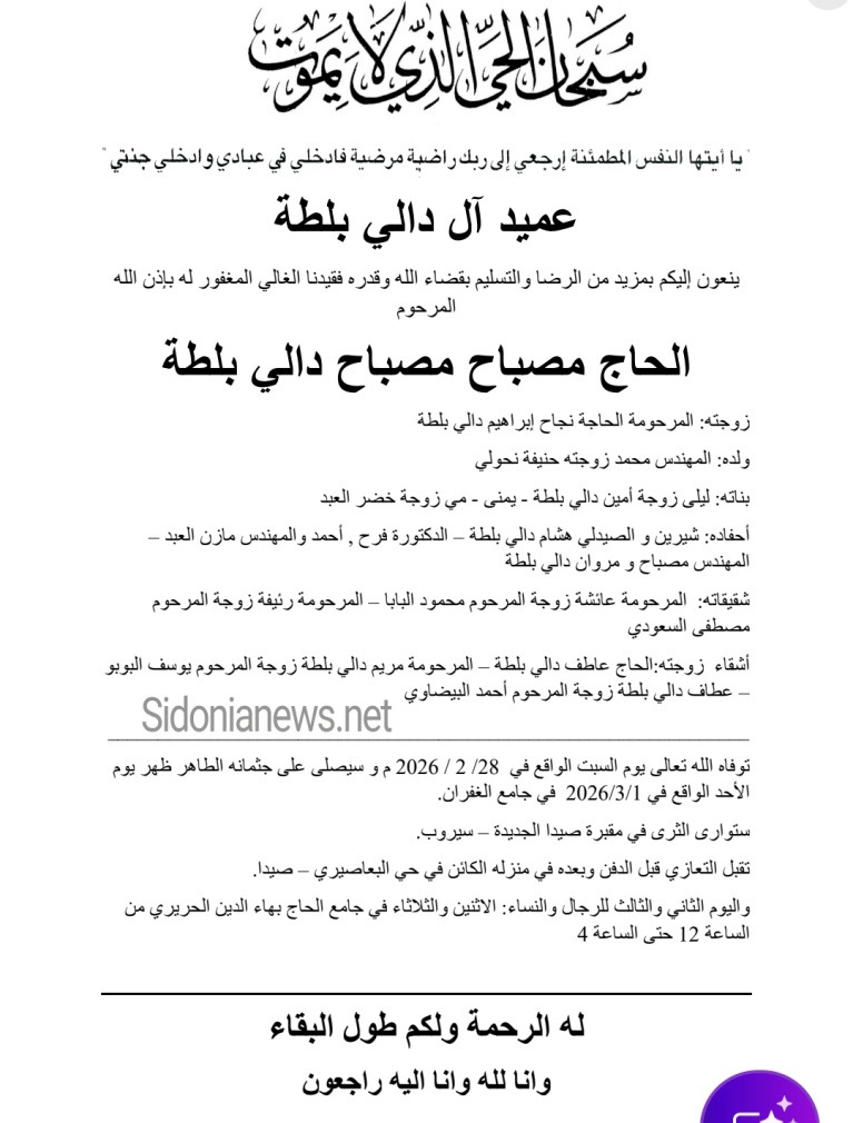 وفاة الحاج مصباح مصباح دالي بلطة 28-2-2026 آل دالي بلطه ونحولي والعبد والبابا والسعودي والبوبو والبيضاوي (وفيات صيدا – لبنان – جريدة صيدونيانيوز.نت )