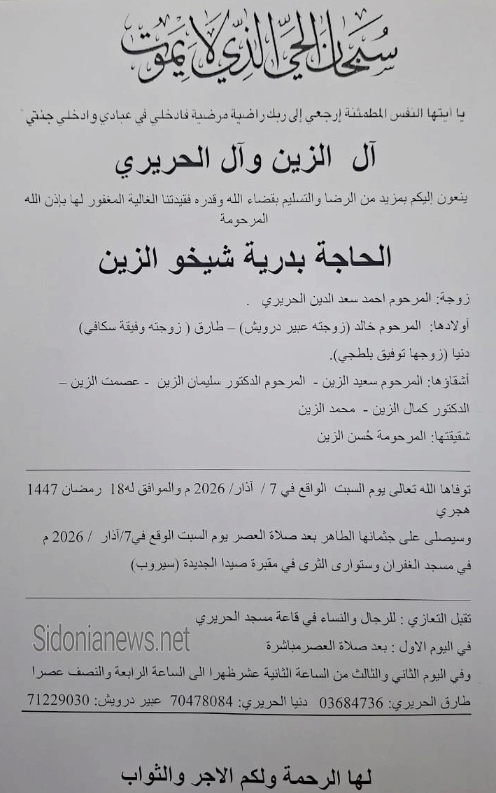 وفاة الحاجة بدريه شيخو الزين 7-6-2026 آل شيخو الزين والحريري ودرويش وسكافي وبلطجي (وفيات صيدا - لبنان - جريدة صيدونيانيوز.نت)