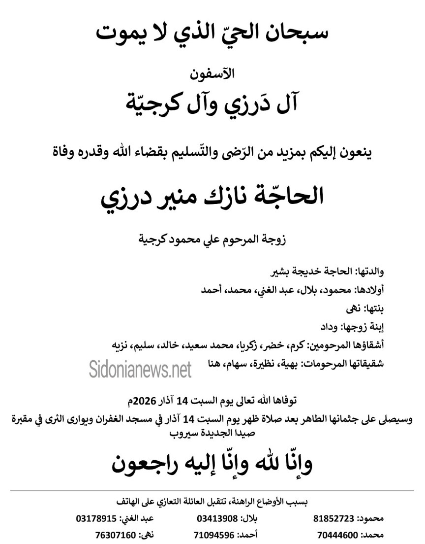 ذكرى ثالث الحاجة نازك منير درزي - 16-3-2026 آل درزي وكرجية (وفيات صيدا لبنان - جريدة صيدونيانيوز.نت)