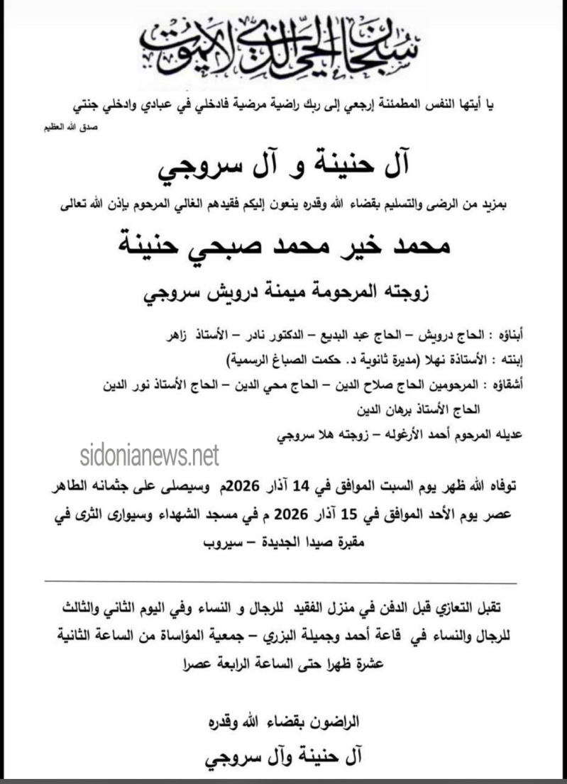 جريدة صيدونيانيوز.نت / وفاة محمد خير محمد صبحي حنينة -14-3-2026