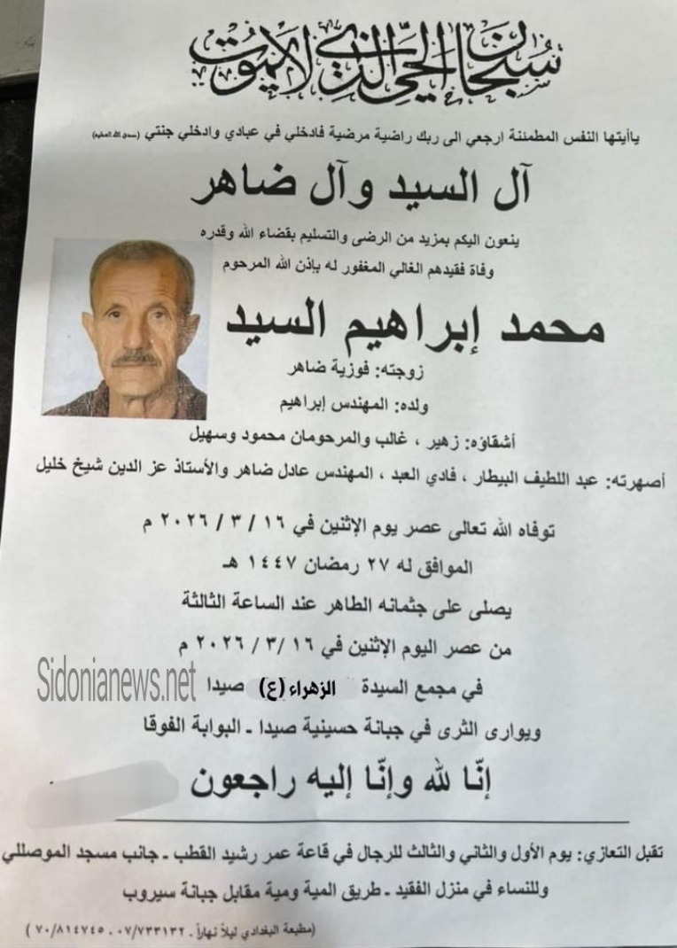 جريدة صيدونيانيوز.نت / وفاة محمد إبراهيم السيد -١٦-٣-٢.٢٦ -آل السید وضاهر (وفيات صيدا لبنان- جريدة صيدونيانيوز.نت)