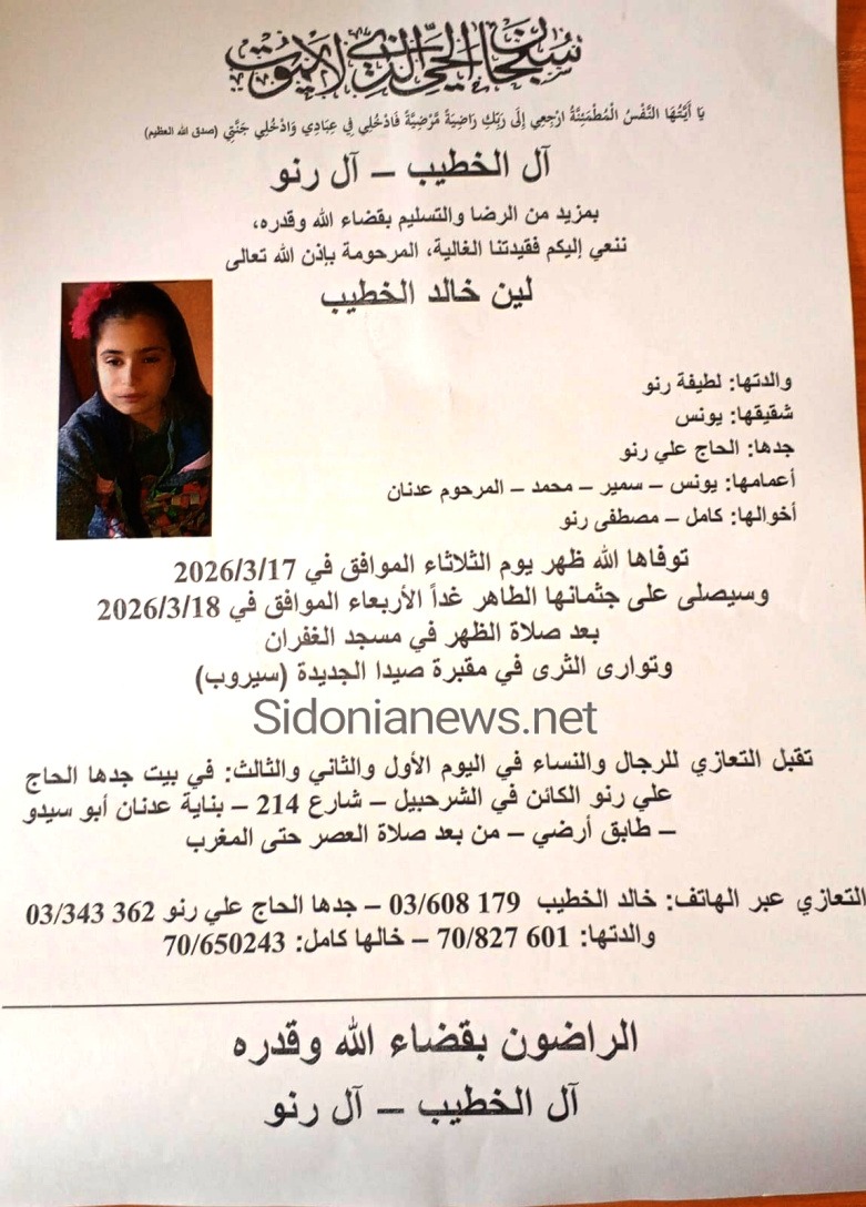 جريدة صيدونيانيوز.نت / وفاة الطفلة لين خالد الخطيب 18-3-2026 آل الخطيب ورنو (وفيات صيدا – لبنان – جريدة صيدونيانيوز.نت )
