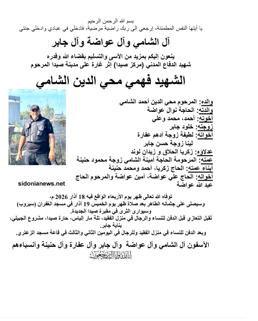 بيان نعي عائلة شهيد الدفاع المدني فهمي محي الدين الشامي والدفن 19-3-2026 آل الشامي وعواضة وجابر وعفارة والحلاق ولوند (وفيات صيدا – لبنان – جريدة صيدونيانيوز.نت )
