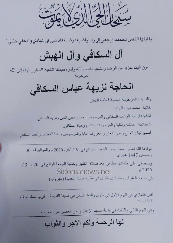 جريدة صيدونيانيوز.نت / وفاة الحاجة نزيهة عباس السكافي 20-3-2026 آل السكافي والهبش (وفيات صيدا لبنان - جريدة صيدونيانيوز.نت ) 2026-03-20 Sidonianews.net ------------ وفاة الحاجة نزيهة عباس السكافي 20-3-2026 آل السكافي والهبش (وفيات صيدا لبنان - جريدة صيدونيانيوز.نت ) 2026-03-20