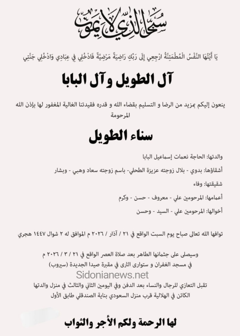 وفاة سناء الطويل -21-3-2026 آل البابا والطويل (وفيات صيدا لبنان - جريدة صيدونيانيوز.نت)
