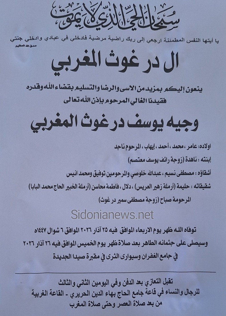 وفاة وجيه يوسف درغوث المغربي -الدفن الخميس 26-3-2026 -آل درغوث ومعتصم والعريس والبابا (وفيات صيدا لبنان -جريدة صيدونيانيوز.نت)