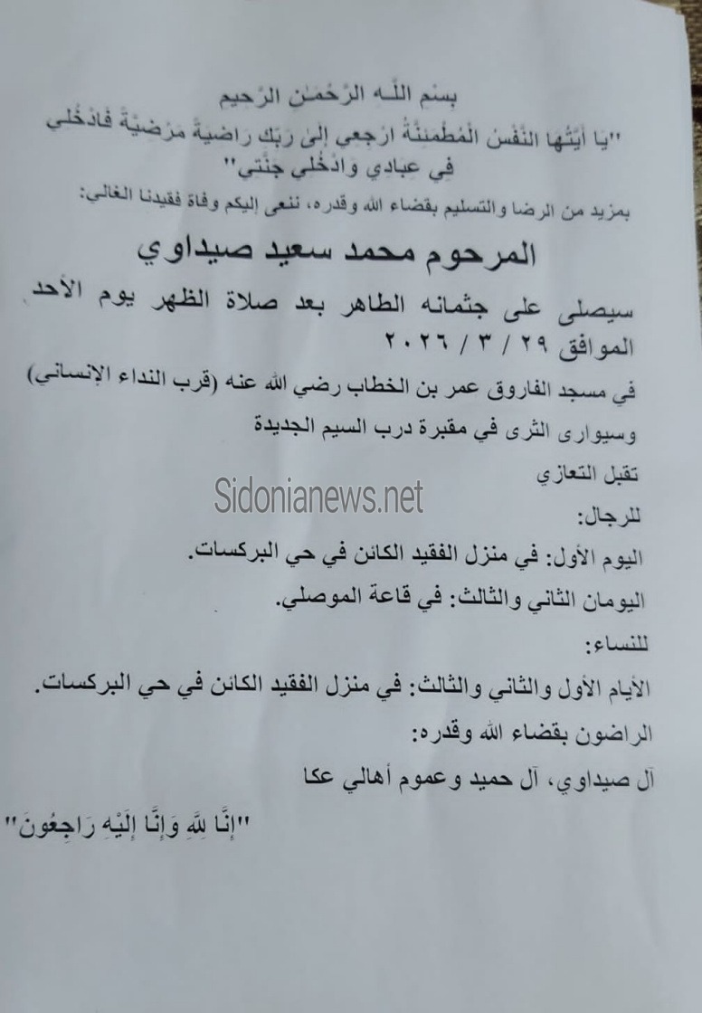 جريدة صيدونيانيوز.نت / وفاة محمد سعيد صيداوي - الدفن 29-3-2026 آل صيداوي وحميد (وفيات صيدا - لبنان - فلسطين - جريدة صيدونيانيوز.نت) 2026-03-28 Sidonianews.net ------------ وفاة محمد سعيد صيداوي - الدفن 29-3-2026 آل صيداوي وحميد (وفيات صيدا - لبنان - فلسطين - جريدة صيدونيانيوز.نت) 2026-03-28