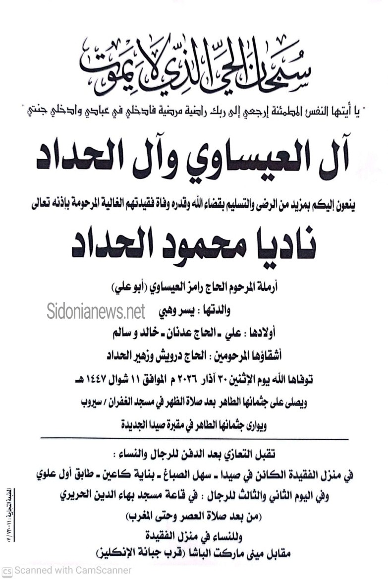 جريدة صيدونيانيوز.نت / وفاة ناديا محمود الحداد - 30-3-2026- آل العيساوي والحداد ووهبي (وفيات صيدا - لبنان - جريدة صيدونيانيوز.نت ) 2026-03-30 Sidonianews.net ------ وفاة ناديا محمود الحداد - 30-3-2026- آل العيساوي والحداد ووهبي (وفيات صيدا - لبنان - جريدة صيدونيانيوز.نت ) 2026-03-30