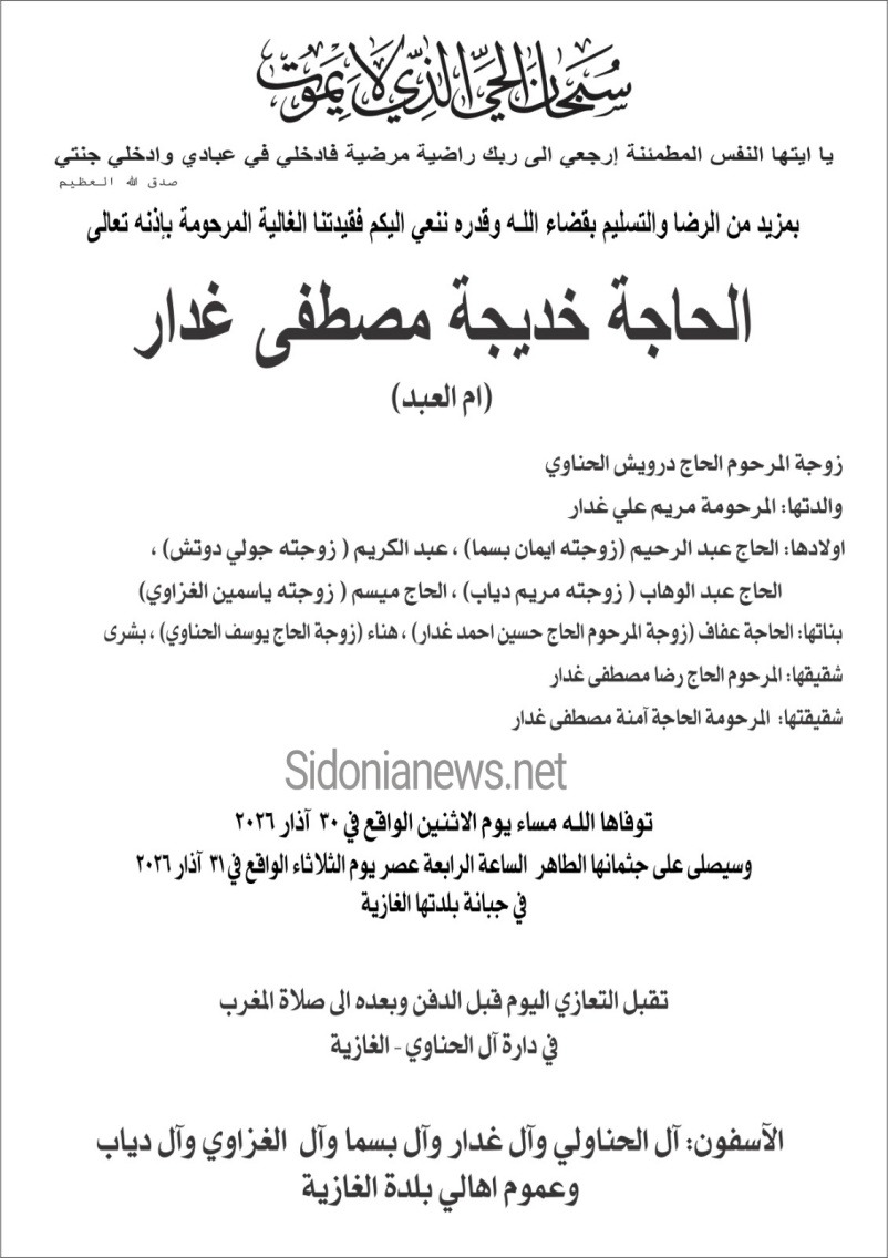 وفاة الحاجة خديجة مصطفى غدار 31-3-2026 آل غدار والحناوي وبسما ودوتش ودياب والغزاوي وعموم أهالي الغازيه (وفيات الغازيه - صيدا - لبنان - جريدة صيدونيانيوز.نت )