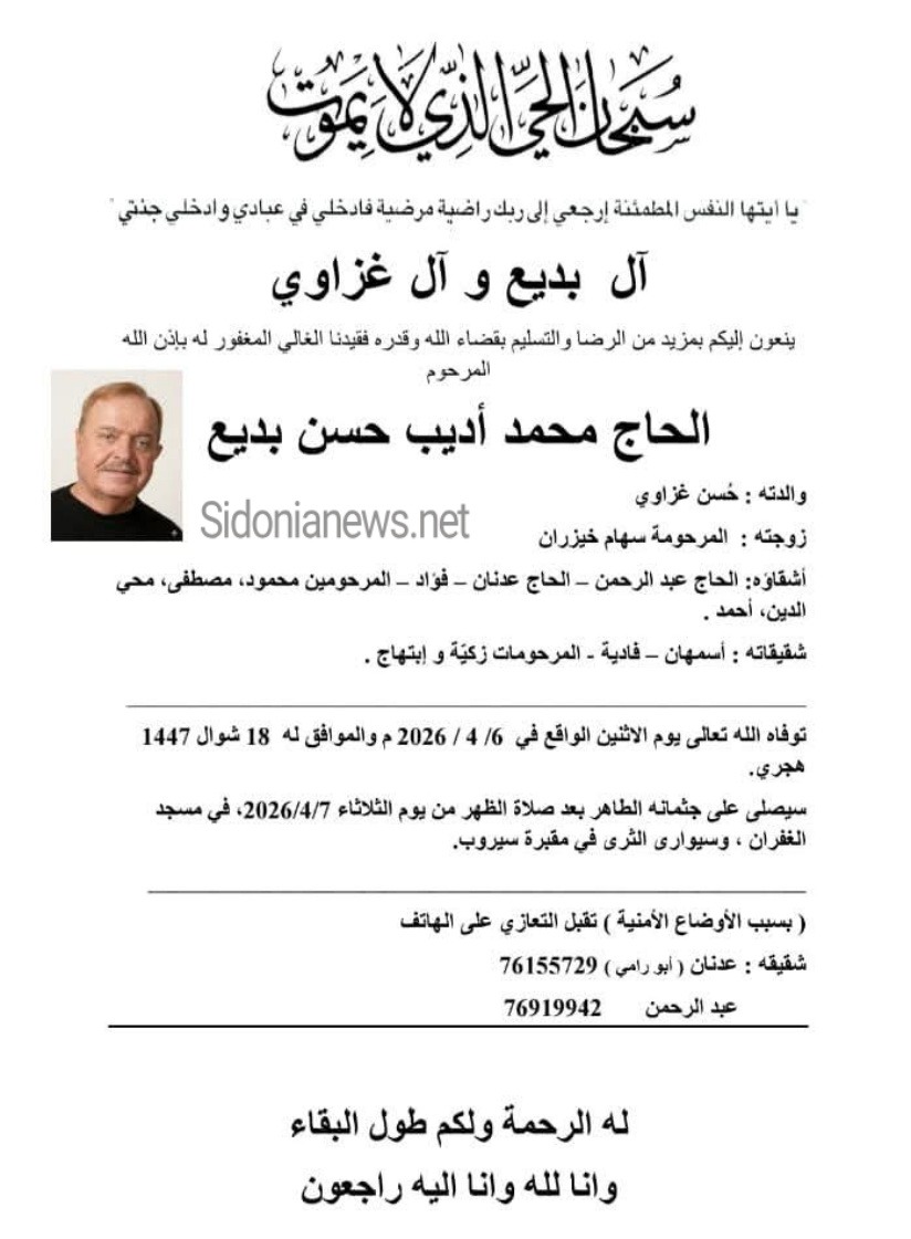 جريدة صيدونيانيوز.نت / وفاة الحاج محمد أديب حسن بديع 7-4-2026 آل بديع وغزاوي وخيزران (وفيات صيدا – لبنان – جريدة صيدونيانيوز.نت)