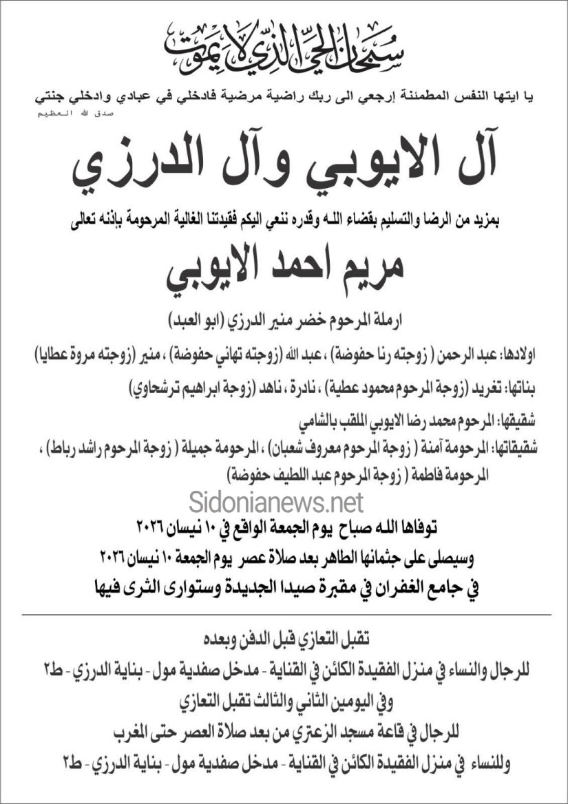 جريدة صيدونيانيوز.نت / وفاة مريم أحمد الأيوبي -10-4-2026 آل الأيوبي والدرزي (وفيات صيدا لبنان - جريدة صيدونيانيوز|.نت) 2026-04-11 Sidonianews.net ---------- وفاة مريم أحمد الأيوبي -10-4-2026 آل الأيوبي والدرزي (وفيات صيدا لبنان - جريدة صيدونيانيوز|.نت) 2026-04-11