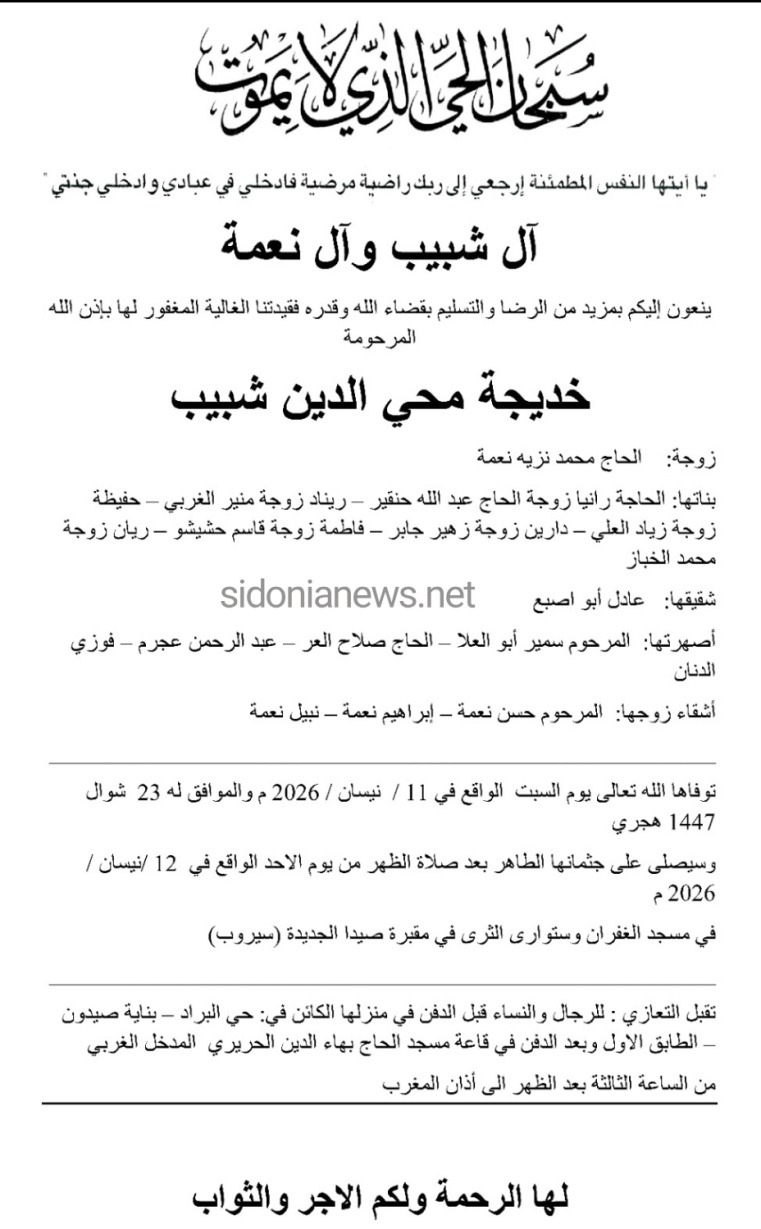 جريدة صيدونيانيوز.نت / وفاة خديجة محي الدين شبيب -12-4-2026 -آل شبيب ونعمة (وفيات صيدا لبنان -جريدة صيدونيانيوز.نت)