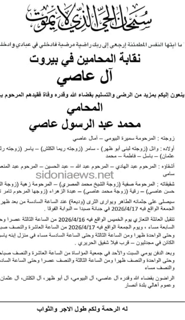 تعديل في مراسم تشييع المحامي محمد عبد الرسول عاصي والدفن الجمعة في بلدته أنصار 17-4-2026 آل عاصي وعموم أهالي بلدة أنصار ونقابة المحامين في بيروت (وفيات أنصار - صيدا – لبنان – جريدة صيدونيانيوز.نت)