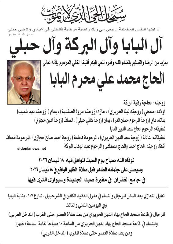 وفاة الحاج محمد علي محرم البابا 18-4-2026 آل البابا والبركة وحبلي والحريري والصفديه وشبيب والعر وحجازي (وفيات صيدا – لبنان – جريدة صيدونيانيوز.نت )