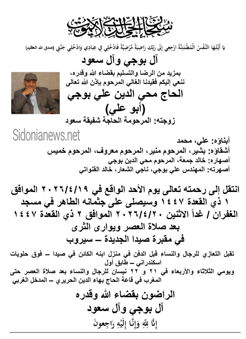 وفاة الحاج محي الدين علي بوجي - الدفن 20-4-2026 آل بوجي وسعود والشعار وقنواتي (وفيات صيدا لبنان - جريدة صيدونيانيوز.نت )