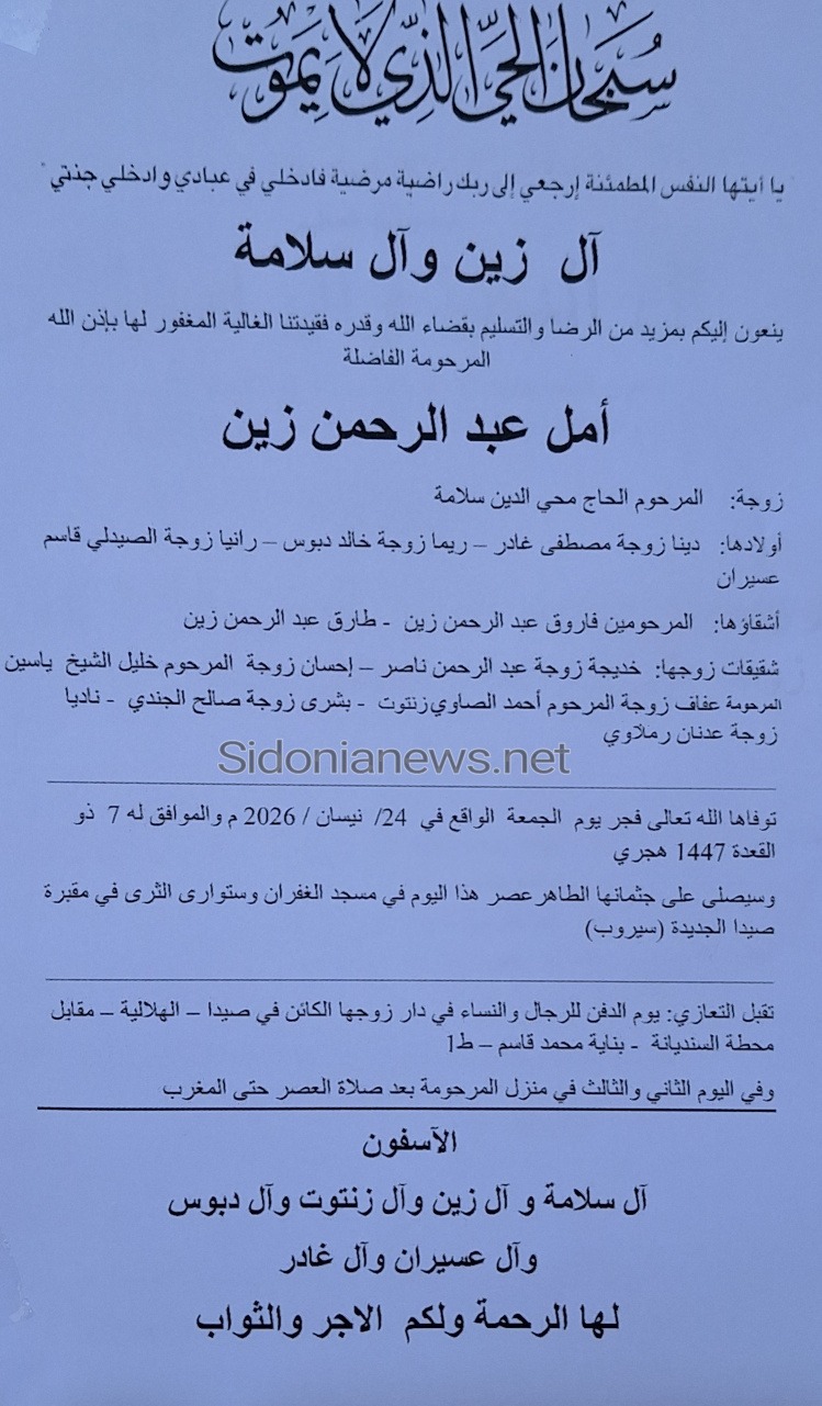 وفاة أمل عبد الرحمن زين 24-4-2026 آل زين وسلامة وغادر ودبوس وعسيران وناصر وياسين والصاوي زنتوت والجندي ورملاوي (وفيات – صيدا – لبنان – جريدة صيدونيانيوز.نت )