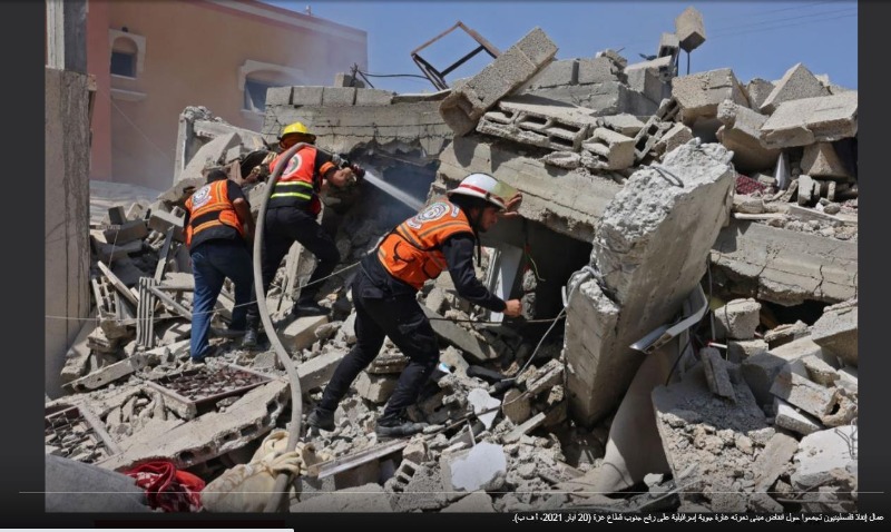 عمال إنقاذ فلسطينيون تجمعوا حول انقاض مبنى دمرته غارة جوية إسرائيلية على رفح جنوب قطاع غزة (20 ايار 2021، أ ف ب).