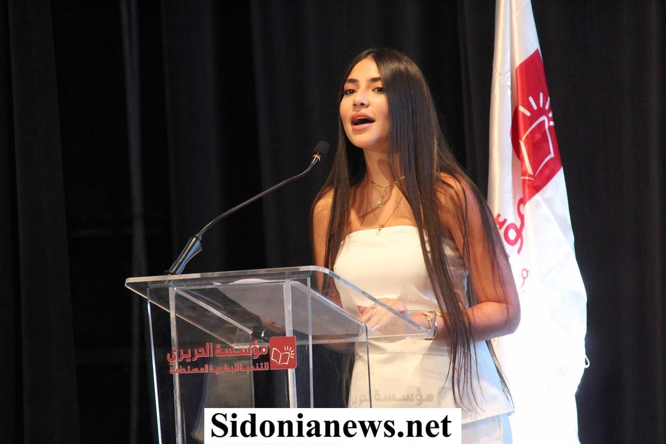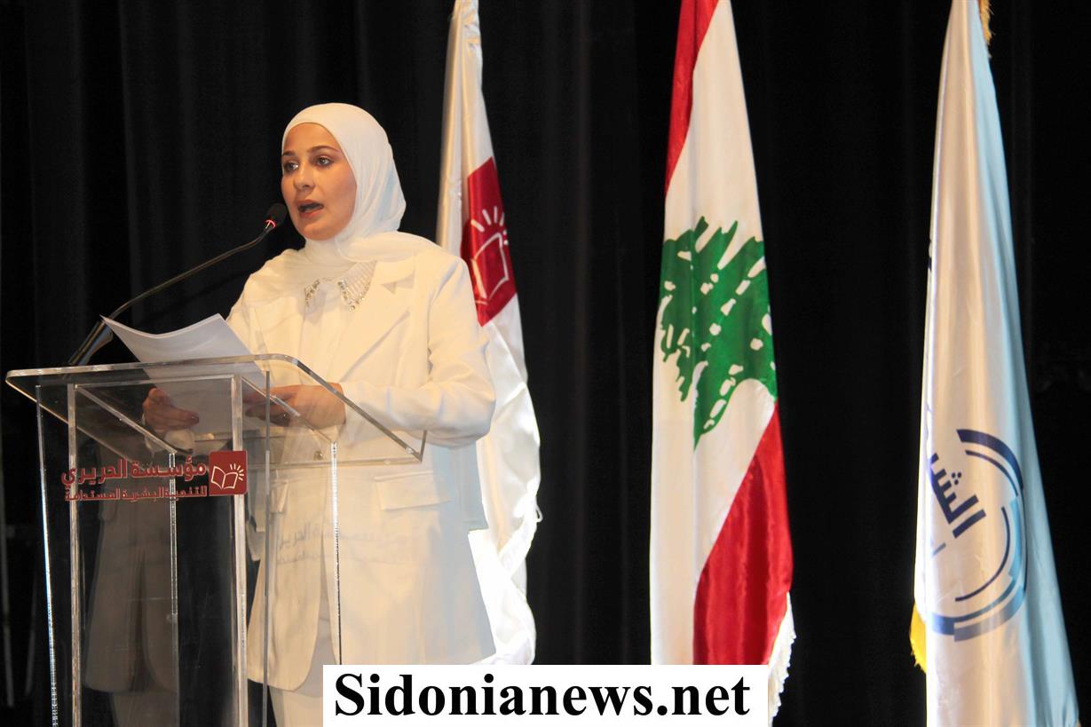 وبعد عرض فيديو بواسطة الذكاء الإصطناعي تحت عنوان: "من حقي أن أسأل" ، ألقت السيدة الحريري كلمة قالت فيها: نلتقي اليوم لنرفع راية الفرح والفخر، ونحتفل بقطف ثمار سنوات من الجهد والعطاء، ونكرّم المتفوّقات والمتفوّقين الذين رفعوا اسم صيدا والجنوب ولبنان عالياً في إمتحانات الشّهادات الرّسمية.. بقصص نجاح صنعها الإصرار والطموح والحلم الكبير، حلم لبنان الآمن المستقر، لبنان الذي يليق بشبابه وشاباته لبنان البناء والإبداع والنجاح.