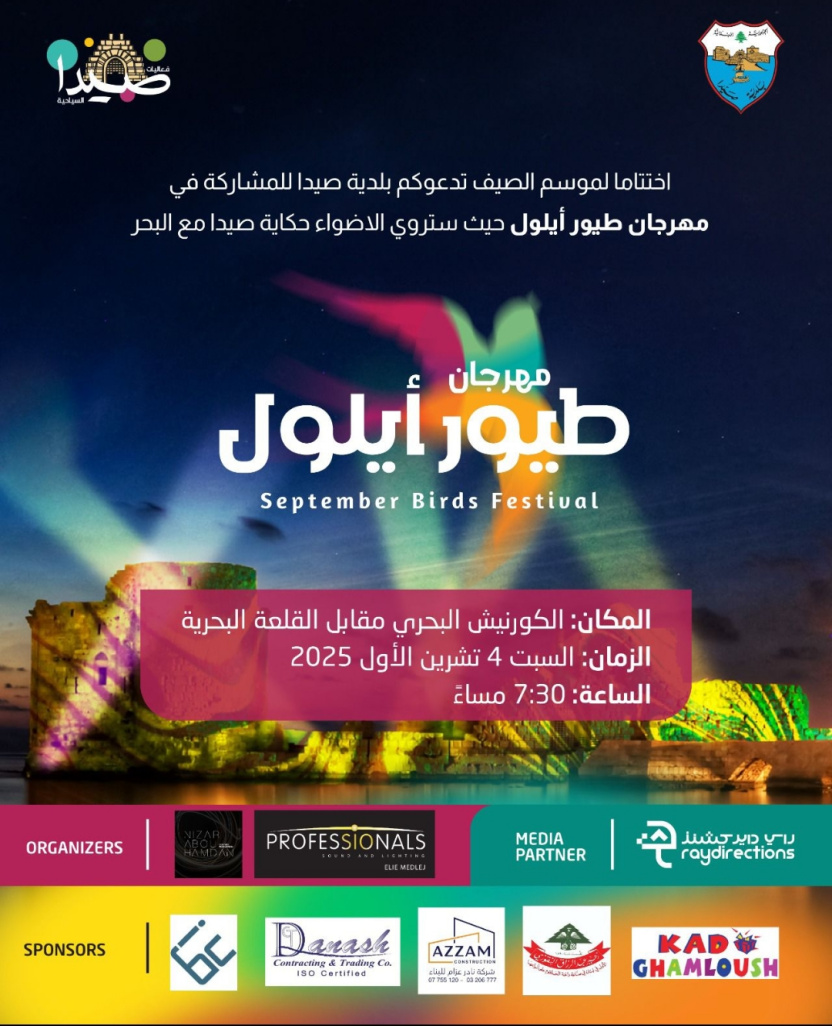 بلدية صيدا تطلق ليلة من ليالي ألف ليلة وليلة: الدعوة عامة لـ  مهرجان طيور أيلول  الأول من نوعه في المدينة حيث ترسم الإضاءة صورا تروي قصة صيدا مع البحر عبر التاريخ: