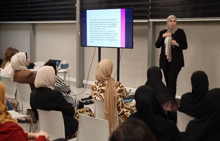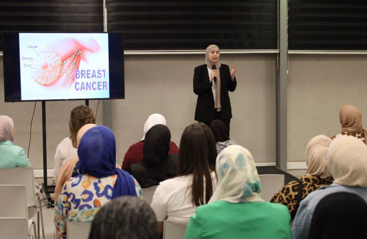 ثم تحدّثت الدكتورة فاطمة الحاج، المتخصّصة في طب النساء، حيث قدّمت شرحًا طبيًا مبسّطًا حول سرطان الثدي، وأهمية الفحص الدوري ووسائل الوقاية، وأجابت عن أسئلة الحاضرات.