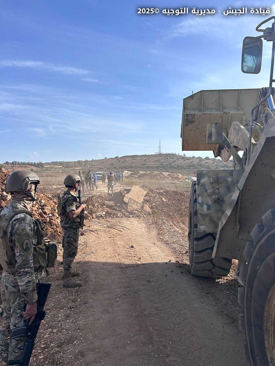 بتاريخ 20 /10 /2025 وضمن إطار متابعة الخروقات والاعتداءات الاسرائيلية المتكررة، عملت وحدة من الجيش بالتنسيق مع قوة الأمم المتحدة المؤقتة في لبنان – اليونيفيل على إزالة عدد من المكعبات الإسمنتية والسواتر الترابية التي كان العدو الإسرائيلي قد أقامها بتاريخ 19 /10 /2025 ليلاً في خراج بلدة عيترون – بنت جبيل، لقطع طريق في البلدة ومنع الأهالي من الوصول إلى أراضيهم.