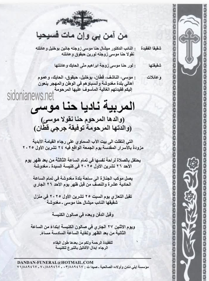 غيب الموت المربية ناديا حنا موسى، شقيقة النائب الدكتور ميشال موسى. ويحتفل بالصلاة لراحة نفسها، في تمام الساعة الثالثة من بعد ظهر يوم الأحد الواقع فيه 26 تشرين الأول الحالي، في كنيسة السيدة في بلدة مغدوشة.