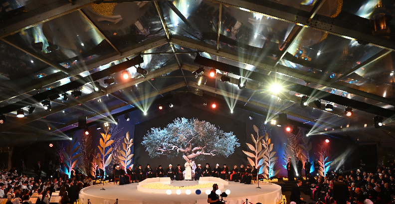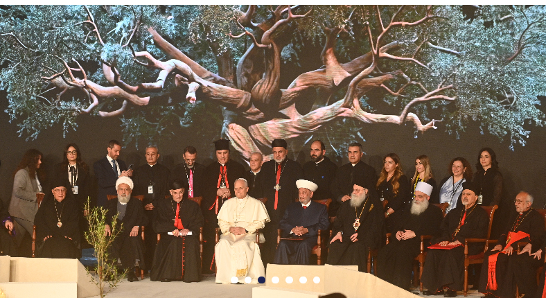 على منصة نصف دائرية حملت في رمزيتها معاني المساواة والألفة وعلى خلفية شجرة زيتون تحمل إرث لبنان وتشكل رمزًا للسلام ووسط بحر متماوج من الشموع في رمز للنور الذي يبدد الظلمة ويدعونا إلى إنارة القلوب بالإيمان و المحبة والتواضع كما ورد في كلمة البابا لاوون اجتمع حول الحبر الأعظم ممثلو مختلف الأديان والطوائف في لبنان ليقدموا للعالم أجمع صورة أبعد من اللحظة الآنية: صورة تعبر عن "اكتشاف حضور الله وراء كل الحدود والدعوة إلى البحث عنه معًا بخشوع وتواضع".