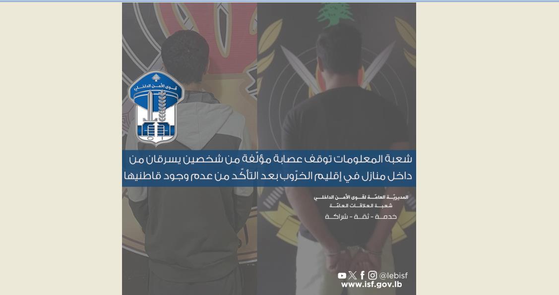 "في إطار المتابعة اليوميّة التي تقوم بها قطعات قوى الأمن الدّاخلي للحدّ من الجرائم في مختلف المناطق اللّبنانية، توافرت معطيات لدى شعبة المعلومات حول قيام أشخاص مجهولين بعمليّات سرقة من داخل منازل في منطقة إقليم الخرّوب، وبخاصةٍ في بلدَتَي شحيم وعانوت، حيث كثّفت الشّعبة إجراءاتها الميدانيّة والاستعلاميّة لتحديد أفراد عصابة السّرقة وتوقيفهم.