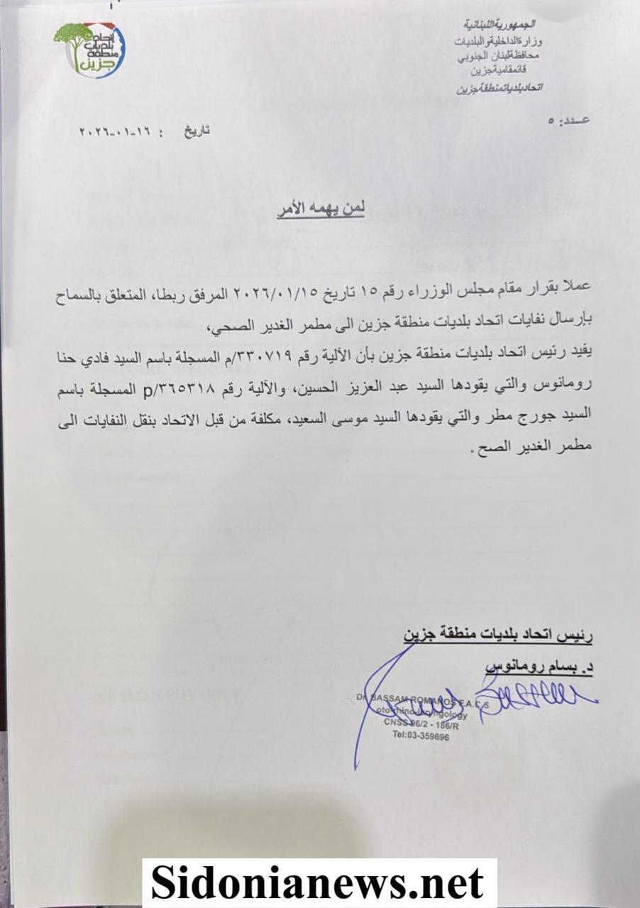 تم الإعلان في جزين عن بدء فعلي لجمع ونقل النفايات من مختلف بلدات قضاء جزين بعد الأزمة التي عاشتها هذه البلدات منذ نحو أسبوع . وأفيد في هذا المجال أن هذه الخطوة جاءت بناء لتعليمات رئيس إتحاد بلديات جزين الدكتور بسام رومانوس , وذلك بعد سلسلة من التفاهمات واللقاءاتت التنسيقية التي شارك فيها رومانوس مع الجهات المعنية ومن بينها مع عضوي تكتّل "الجمهورية القويّة" النائبين غادة أيوب وسعيد الأسمر، حيث تم التوافق على آلية واضحة لمعالجة ملفّ النفايات بما يراعي مصلحة الأهالي والبلديات على حدّ سواء.