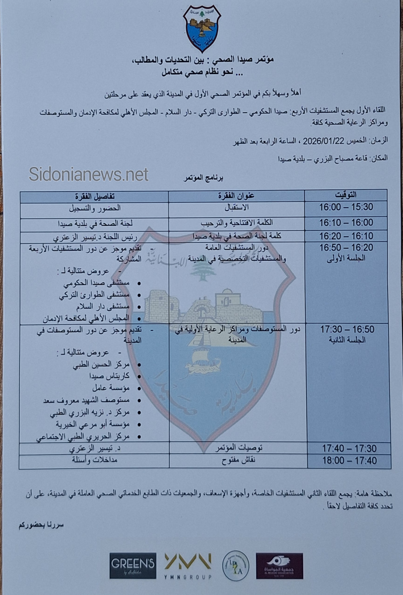 وأُقيم المؤتمر في قاعة مصباح الزين في بلدية صيدا، بحضور حشد من الفاعليات والشخصيات في القطاعين الطبي والصحي، إلى جانب ممثلين عن هيئات ومؤسسات اجتماعية وثقافية.