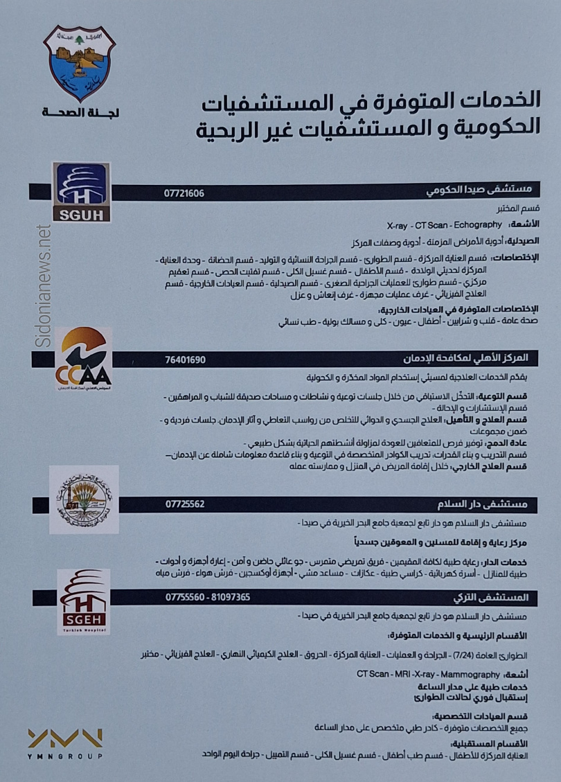 تمحورت الجلسة الأولى من مؤتمر صيدا الصحي، الذي انعقد في بلدية صيدا، في نسخته الأولى، حول دور المستشفيات الحكومية وغير الربحية في المدينة، وأهميتها في تقديم الرعاية الصحية المتكاملة لسكان المدينة، بحضور عضو لجنة الصحة في بلدية صيدا لينا العلم عبود، وممثلي المستشفيات الأربع: الدكتورة ألين بو سابا عن مستشفى صيدا الحكومي، أيمن الحريري عن المستشفى التركي، هناء أبو علفا عن مستشفى دار السلام لرعاية المسنين، وماجد حمتو عن المجلس الأهلي لمكافحة الإدمان.
