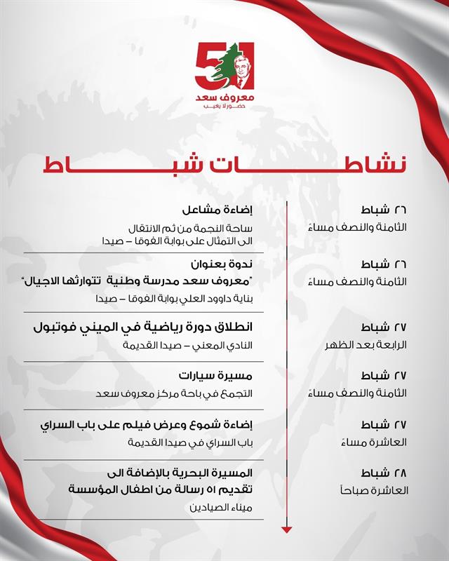 أخبار مدينة صيدا / برنامج نشاطات شباط ضمن فاعليات الذكرى ال 51 لاستشهاد المناضل معروف سعد