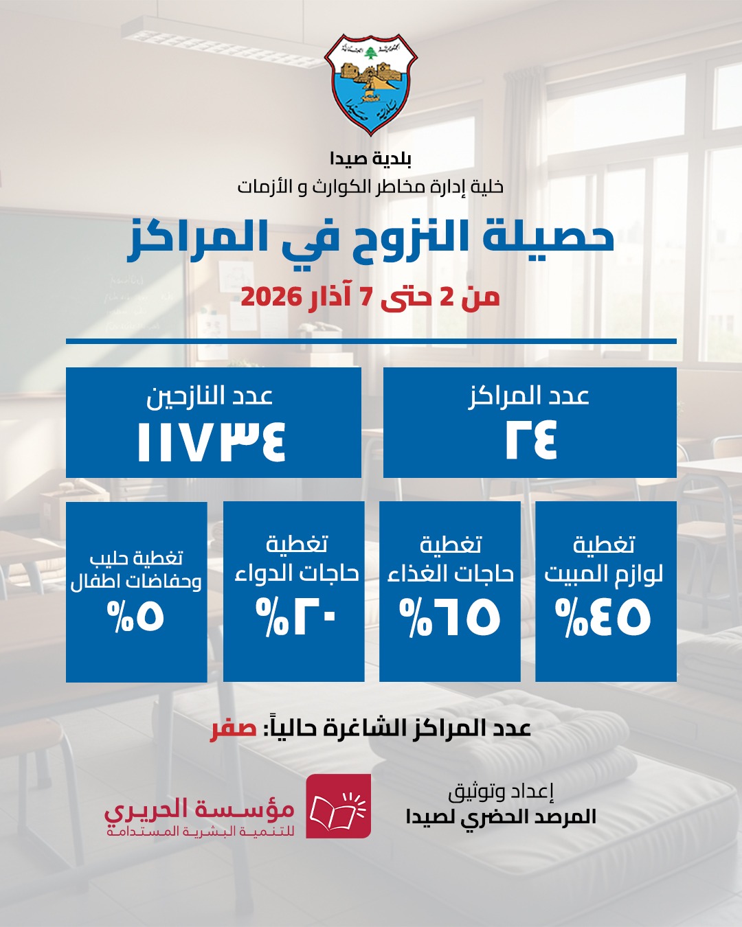 بلدية صيدا في تحديث إحصائي جديد لعدد النازحين : 11734 توزعوا على 24 مركز إيواء وتناشد الحكومة والمنظمات الدولية لتقديم دعم إستثنائي وفوري