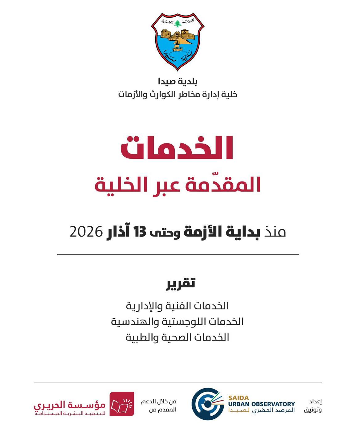 عممت بلدية صيدا تقرير الخدمات المقدمة عبر الخلية إلى بلدية صيدا منذ بداية الأزمة والعدوان الإسرائيلي من بداية آذار حتى 13 آذار 2026
