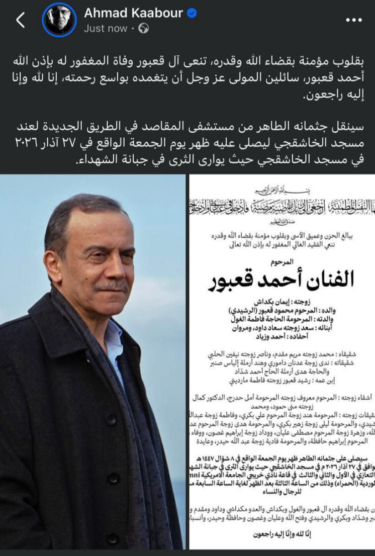 وفاة الفنان اللبناني أحمد محمود قعبور (الرشيدي) -26-3-2026 رحمه الله