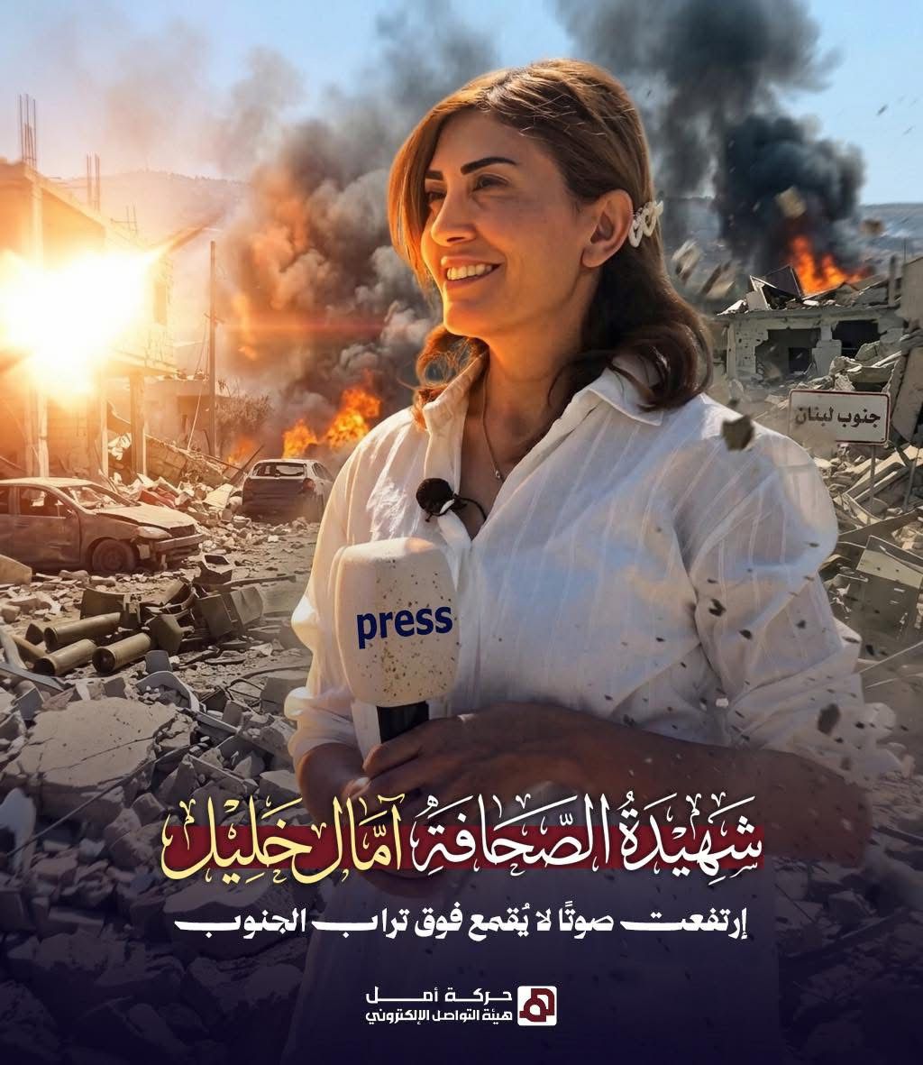 استشهدت الزميلة أمال خليل، مراسلة «الأخبار» في بلدة الطيري جنوب لبنان، اليوم الأربعاء، إثر غارةٍ إسرائيلية استهدفتها بشكلٍ مباشر مع زميلتها المصوّرة زينب فرج، بعد لجوئهما إلى أحد المنازل للاحتماء من غارةٍ أولى كانت قد استهدفت سيارة أمامهما. وقد حاصر الاحتلال المراسلتَين، وعند وصول فرق الصليب الأحمر لإغاثتهما، ألقى قنبلةً صوتية على سيارة الإسعاف ثم أطلق النار عليها، ما حال دون تمكّن فريق الإنقاذ من انتشال خليل. ونُقلت فرج إلى مستشفى تبنين الحكومي حيث خضعت لعملية جراحية في الرأس، كما نُقل جثمانا الشهيدين اللذين كانا في السيارة المستهدفة.