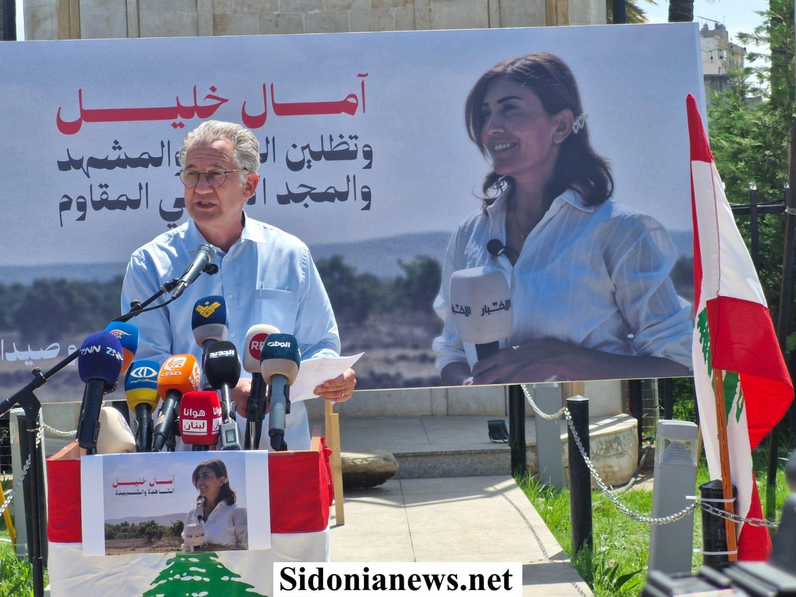 الاحتفال استُهلّ بكلمة إعلاميي صيدا ألقاها الزميل محمود الزيات فشدّد على أن استشهاد آمال خليل ليس حدثاً عابراً بل جريمة موصوفة بحق الصحافة ومحاولة لإسكات صوتٍ لا يُشترى.