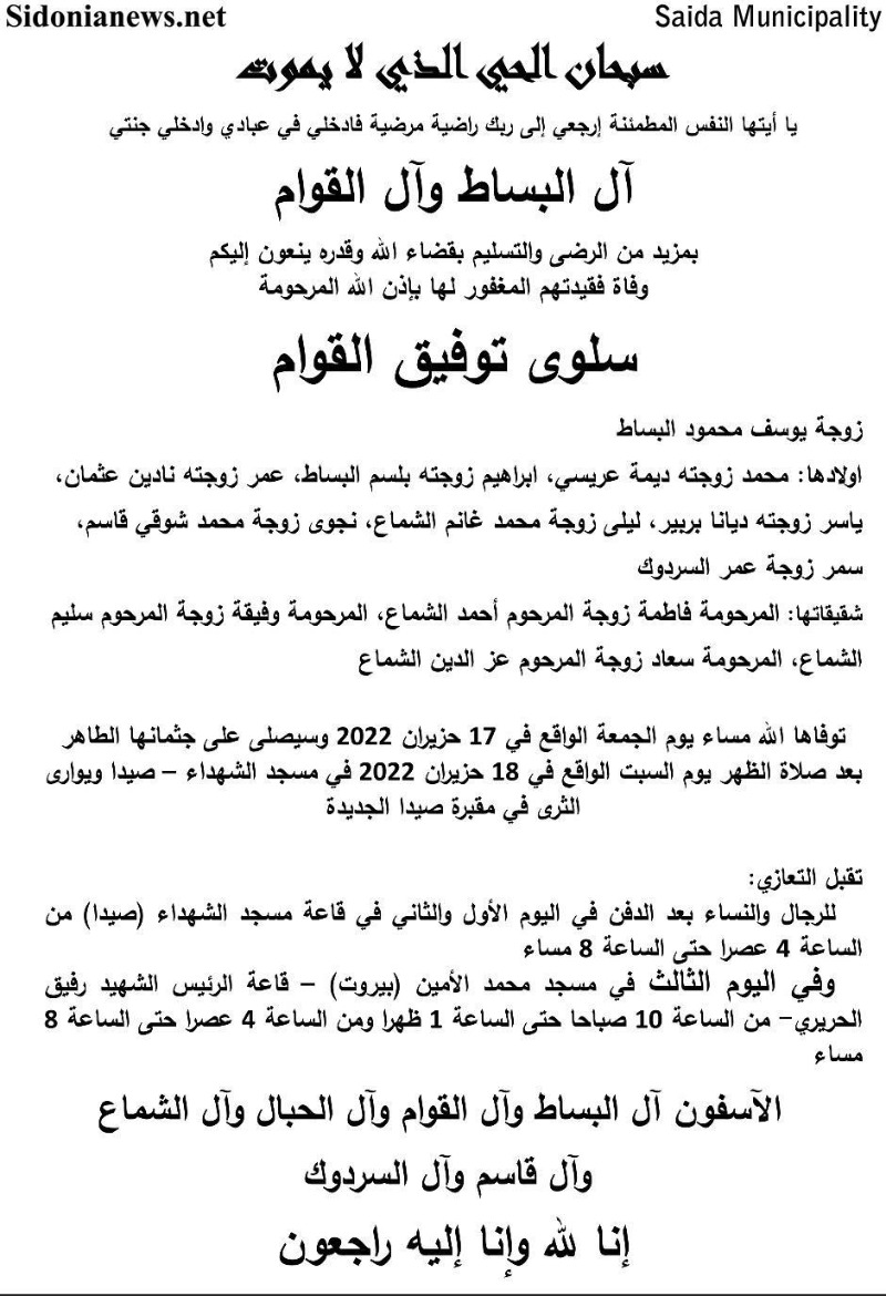سلوى توفيق البساط 18-6-2022 آل البساط والقوام والحبال والشماع وقاسم والسردوك وعريسي وعثمان (وفيات صيدا لبنان - جريدة صيدونيانيوز.نت)